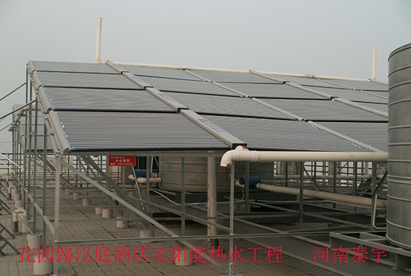 漢庭酒店:該圖為鄭州漢庭商務(wù)酒店太陽能熱水系統(tǒng)施工完畢圖,太陽能集熱面積約220m2,本項(xiàng)目采用力諾真空集熱管太陽能與燃?xì)忮仩t相結(jié)合,屬于節(jié)能環(huán)保項(xiàng)目,年節(jié)能率高達(dá)百分之80以上。該熱水項(xiàng)目晴好天氣時(shí)每天可產(chǎn)16T左右的熱水,完全可以滿足甲方使用要求,達(dá)到大節(jié)能效果。