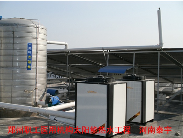 鄭州職工醫(yī)用機(jī)構(gòu)太陽能熱水工程:該圖為鄭州職工醫(yī)院太陽能熱水工程,該項目主要采用美的太陽能集熱器與空氣能熱泵相結(jié)合,單個系統(tǒng)日供熱水量約為8T左右,節(jié)能效果顯著!